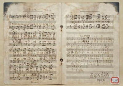 图片自上而下为连环画《铁道游击队》封面、《游击队歌》曲谱手稿。 |