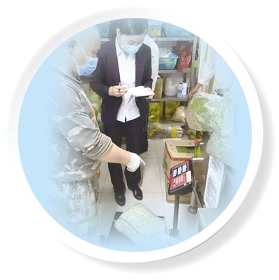 采购员兼仓库管理员崔谨(左二)正在清点进货,称重去皮大蒜。 |