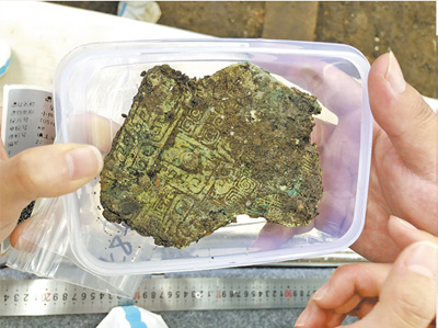 8号坑出土的青铜容器残片,纹饰精美繁复。 |
