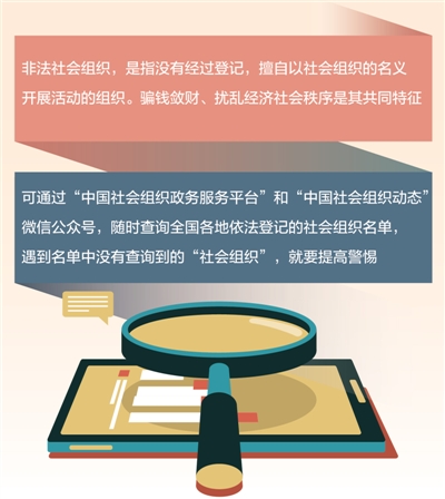 对照合法登记名单识别非法社会组织,提高防范意识,防止被骗