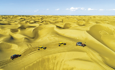 5月14日,新疆塔克拉玛干沙漠北缘的尉犁县罗布人村寨景区迎来降雨,沙漠在蓝天的映衬下别样美丽。游客乘坐全地形沙漠越野车游览美景,享受着雨后沙漠的凉爽天气。沙漠旅游火起来,沙漠生“金”,拉动当地经济发展。