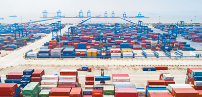 五月十七日,江苏南通通海港区集装箱码头及作业区一片忙碌景象。一至四月,南通港累计完成集装箱吞吐量六十三点二万标箱,其中,国际航线同比增长百分之七十九。