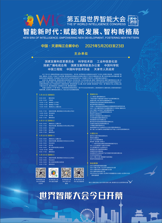 经党中央、国务院批准,国家发展和改革委员会、科学技术部、工业和信息化部、国家广播电视总局、国家互联网信息办公室、中国科学院、中国工程院、中国科学技术协会、天津市人民政府将于2021年5月20日至23日在天津共同主办第五届世界智能大会。本届世界智能大会以“智能新时代:赋能新发展、智构新格局”为主题,形成“会展赛+智能体验”“四位一体”国际化平台,采用线上线下融合的方式,前沿前瞻发布、展览展示丰富、赛事赛程精彩。
