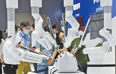 图为5月20日,参观者在观看手术机器人展示。 新华社记者 赵子硕摄