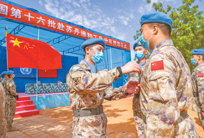 5月20日,中国第十六批赴苏丹达尔富尔维和工兵分队225名官兵被授予联合国“和平荣誉勋章”,并荣获联合国和非洲联盟驻苏丹达尔富尔联合特派团(联非达团)嘉奖。图为在达尔富尔法希尔超级营地中国营区内,维和工兵分队政委王文轩(左)为官兵们佩戴“和平荣誉勋章”。