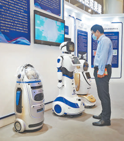 第五届世界智能大会智慧生活展区,一名观众体验与机器人交流。 崔新耀摄