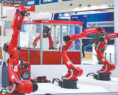 一组火弧焊接机器人正在表演动感“舞蹈”。 本报记者 扎 西摄