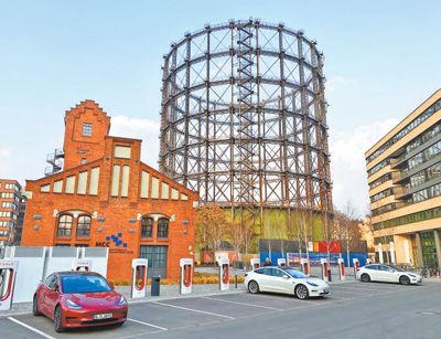 德国欧瑞府能源科技园内,标志性的储气塔、老厂房与新型充电桩共同构成和谐独特的景观。 |