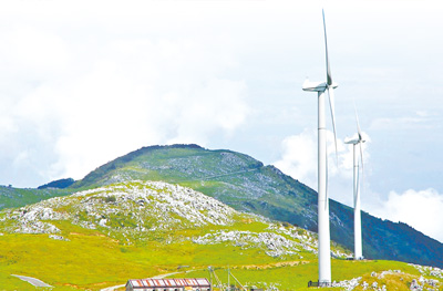 日本梼原町在海拔1000多米的高原上设置的两个600千瓦的风力发电组。 |
