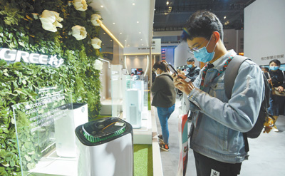 日前举办的中国家电及消费电子博览会上,消费者在观看具有杀菌作用的智慧空气净化器。 |