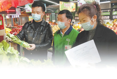 合力惠民生鲜超市南浦路店,考核员代祥俊(左)与同事一起检查生鲜商品质量。 |