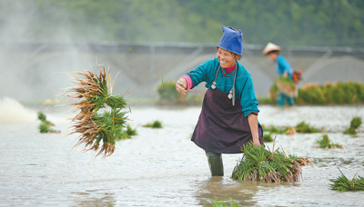 初夏时节,贵州省黔东南苗族侗族自治州丹寨县扬武镇五一苗寨千亩梯田进入插秧季,苗族村民抢抓农时进行插秧,田间地头一派忙碌景象。图为5月23日,村民在梯田里抛秧苗。