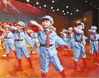 江西省樟树市近日举行以“童心永向党”为主题的“百首童谣颂党恩”传唱大赛,孩子们通过各种丰富多彩的表演,抒发了对党、对祖国、对家乡的热爱之情,表达了“小小少年跟党走”的坚定信念。图为童谣传唱大赛现场。