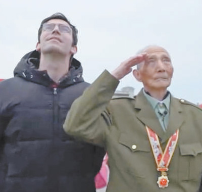 高佑思(左)与军医老爷爷在天安门广场一同观看升旗仪式。 |