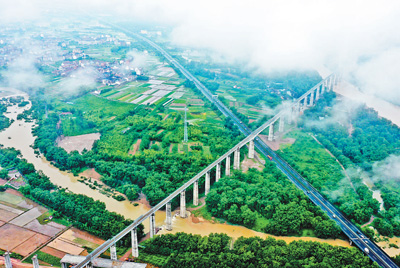 金台铁路是浙江省第一条自主建设的电气化铁路,预计今年6月底前开通运营,届时将结束台州市仙居县、金华市磐安县等地不通铁路的历史。图为6月13日,金台铁路台州市仙居县永安溪特大桥俯视图。
