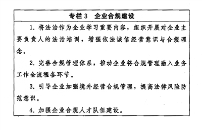 深化依法治企。深化“法律进企业”,落实经营管理人员学法用法制度。加强企业法治文化建设,提高经营管理人员依法经营、依法管理能力。推动企业合规建设,防范法律风险,提升企业管理法治化水平。