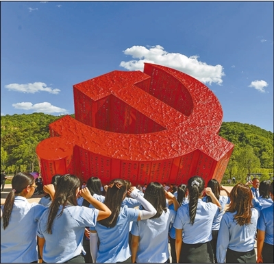 延安市宝塔区南泥湾镇党徽广场,共产党员们在重温入党誓词。 |