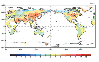 国家气候中心全球监测产品,显示今年3月全球平均气温距平空间分布情况。图中暖色代表气温偏高,冷色代表气温偏低。 |