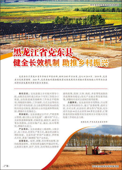 克东县位于黑龙江省齐齐哈尔市东北部,面积2083平方公里,总人口29.9万。2019年,克东县正式脱贫摘帽。2021年,克东县把巩固拓展脱贫攻坚成果同乡村振兴有效衔接工作作为全县经济社会发展的重要任务全力推进。