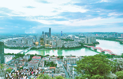 图为6月14日,游客在柳州市马鞍山山顶上观赏百里柳江。