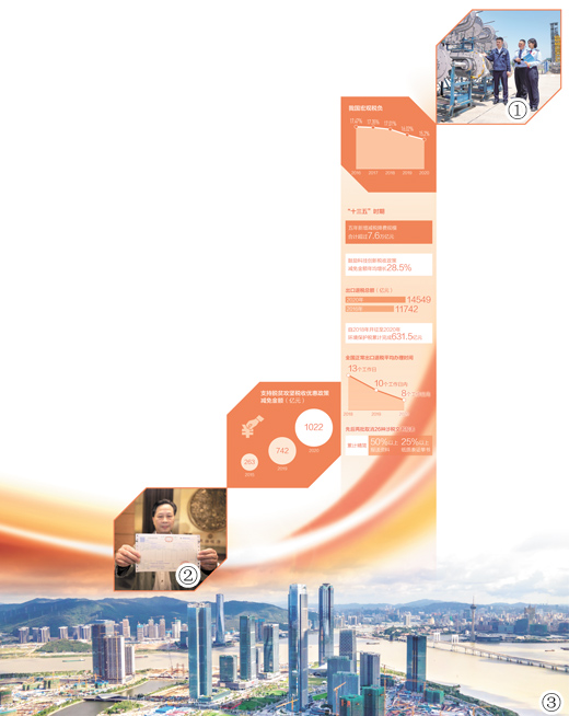 ——减税降费落实落细。2016年至2020年,新增减税降费累计超过7.6万亿元,减税降费的红利源源不断转化为高质量发展的动力。“公司每年都能拿到减税‘红包’,仅企业所得税优惠2018年就享受减免近6万元,2019年减免15万元,2020年又减免15.5万元。”成都新天宏精密机电制造有限公司总经理孙振家说。