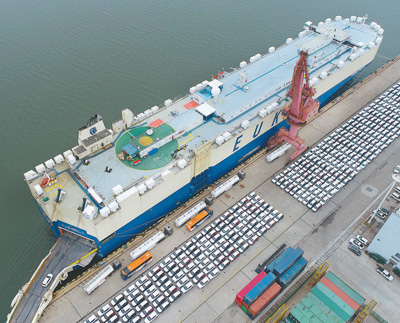 6月16日,一艘大型滚装船在江苏连云港港汽车专用码头装运出口汽车。今年5月份,我国汽车整车出口15.1万辆,同比增长208.4%。