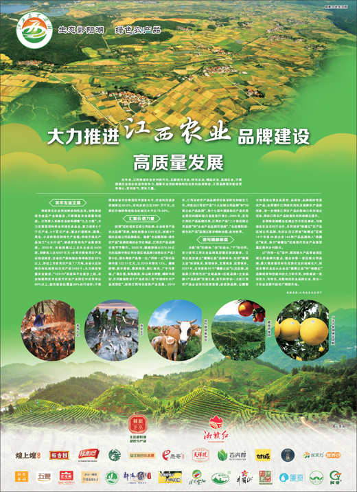 永葆“闯”的精神、“创”的劲头、“干”的作风,努力续写江西农业品牌高质量发展新篇章。江西正逐步建立“赣鄱正品”品牌体系,包括“赣鄱正品”标准体系、管理体系、发展体系、运营体系,2021年,发布首批50个“赣鄱正品”认定品牌,走独具江西特色的“全域品牌+区域品牌+企业品牌+产品品牌”发展之路,吸引和带动一大批江西农产品企业依托优质资源,创优势品牌,让赣鄱大地涌现出更多品质优、品相好、品牌响的优质农产品,全面提升江西绿色有机及富硒农产品新形象,进一步增强江西农产品的影响力和市场占有率,带动江西农产品销售和利润规模化提升。