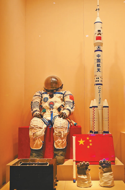 载人航天成就展台相关实物和CZ—2F运载火箭模型。 本报记者 蒋雨师摄