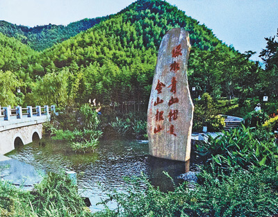 展板图片展示的是浙江安吉余村一角。 本报记者 张武军摄