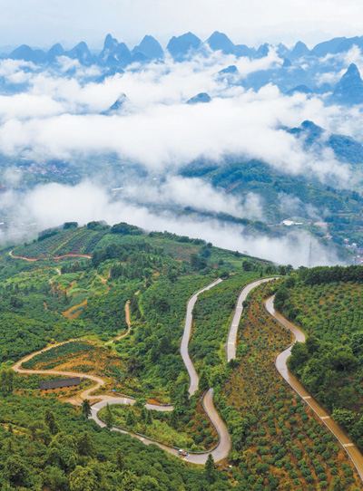 近年来,广西桂林恭城瑶族自治县推进农村公路建设,让全县117个行政村实现了通水泥(沥青)公路。图为莲花镇的盘山公路与云雾峰林交相辉映,美丽如画。