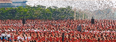 大会现场,和平鸽展翅高飞,现场观众一片欢腾。 |