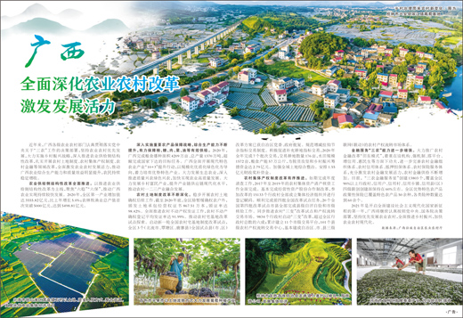 近年来,广西各级农业农村部门认真贯彻落实党中央关于“三农”工作的决策部署,坚持农业农村优先发展,大力实施乡村振兴战略,深入推进农业供给侧结构性改革,扎实开展农村土地制度、农村集体产权制度、农村金融等领域改革,全面激发农业农村发展活力,推动广西农业综合生产能力和质量效益明显提升,农民持续稳定增收。