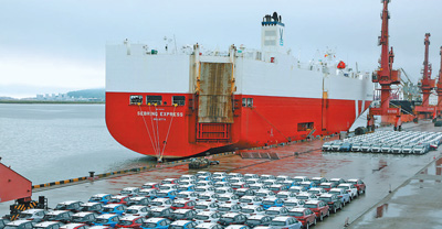 日前,一艘远洋滚装轮靠泊在江苏连云港港东方公司码头,准备装载2200台汽车发往英国,这是连云港港开通的第十五条海外滚装航线。