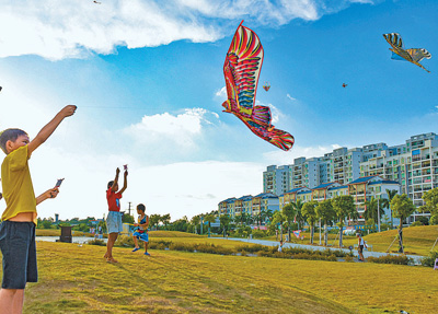 图为7月12日,海丝文化遗址公园,一些家长带着孩子放风筝。