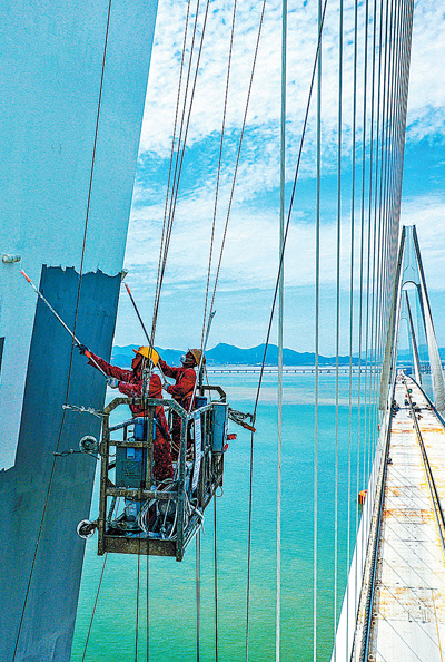7月12日,工人正在150米的高空中为宁波舟山港主通道项目舟岱大桥主塔进行涂装施工。