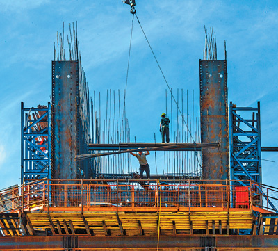 7月15日,杭温高铁浙江省台州市仙居特大桥建设现场,工人冒着高温坚守在岗位上。