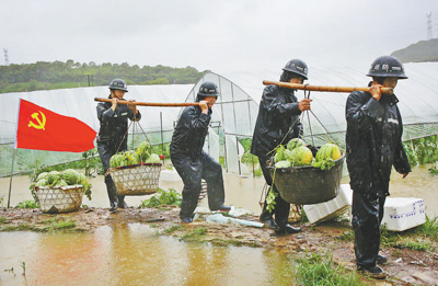 受今年第6号台风“烟花”带来的持续暴雨影响,浙江省舟山市岱山县虎斗村一瓜农的瓜棚发生内涝,岱山县公安局城郊派出所接到求助后,第一时间赶到现场帮瓜农抢收西瓜。图为7月26日,派出所党员民警正在冒雨帮助瓜农抢收。