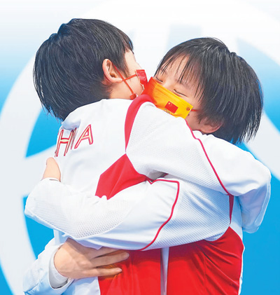 张家齐和陈芋汐(右)在颁奖仪式上拥抱。 |