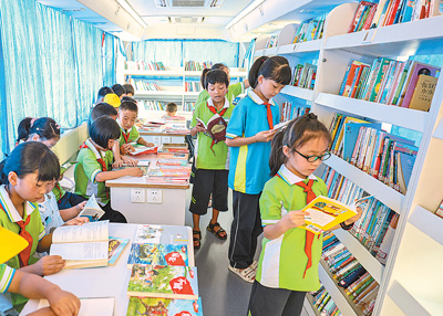8月3日,山东荣成俚岛镇烟墩角村,孩子们在移动图书车里借阅图书。为解决偏远山村孩子们暑期里借书难问题,当地文旅、公交部门开展移动图书车服务,让孩子们在家门口就能便捷地借阅图书。