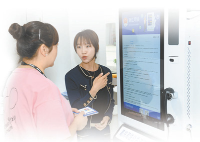 浙江湖州吴兴区爱山商圈商贸调解中心驻站网格员(右)指导商户在智能终端机上查询相关法律法规。 |