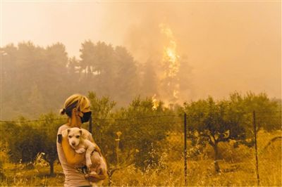 希腊第二大岛埃维亚岛的山火八月八日持续肆虐,数千名居民和游客紧急撤离。图为当天,在希腊埃维亚岛,一名抱着宠物狗的女子在观察火情。