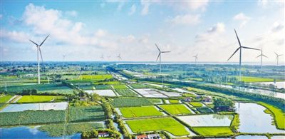 近年来,我国可再生能源装机规模持续扩大,各地推动能源清洁低碳安全高效利用,促进经济社会发展全面绿色转型。江苏省淮安市金湖县利用当地丰富的自然资源,践行绿色发展理念,大力发展新能源,优化能源结构,实现资源效益叠加。截至今年7月底,金湖县新能源装机容量79.38万千瓦。图为金湖县塔集镇的风车与田园风光。