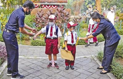 近日,印尼逐步下调多地疫情限制措施级别。8月30日,印尼首都雅加达的学校恢复线下面对面授课。图为当日,学生佩戴口罩进入校园。 |
