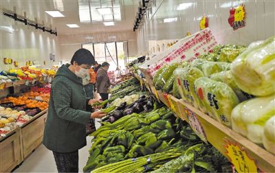 北京昌平区天通苑北街道天通东苑第三社区的居民在“日日生鲜便民直通车”菜店里购买新鲜蔬菜水果。 |
