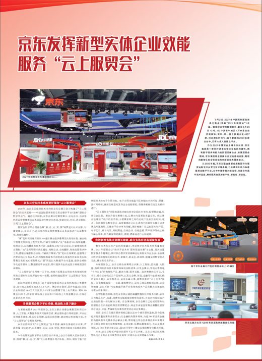 作为2021年服贸会全球合作伙伴,京东集团是一家同时具备实体企业基因和属性、拥有数字技术和能力的新型实体企业,本届服贸会期间,京东集团将全面展示开放的基础设施、高效的数智化社会供应链和创新的技术服务能力。