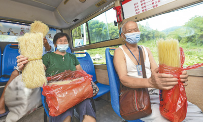图为9月5日,在武义县的一辆集市专线班车上,乘客展示购买的物品。