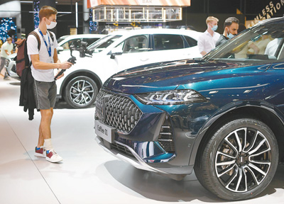 9月6日,中国长城汽车旗下魏牌摩卡(Coffee 01)PHEV(插电式混合动力轿车)车型在德国国际汽车及智慧出行博览会媒体日期间全球首发。据介绍,这款车型纯电续航里程超过150公里。德国国际汽车及智慧出行博览会前身为法兰克福国际车展,7日在慕尼黑正式开幕。图为人们在魏牌汽车展台参观。