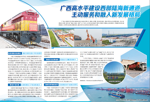 广西认真落实《西部陆海新通道总体规划》要求,高起点部署、高标准谋划、高效率实施、高质量推进,充分发挥区位优势,着力在“畅通、高效、经济”上下功夫,加快打造连接中国与东盟时间最短、服务最好、价格最优的陆海新通道,为西部地区高质量发展、建设现代化经济体系提供有力支撑。