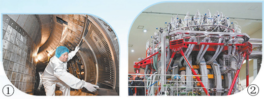 图①为科研人员在全超导托卡马克核聚变实验装置真空室工作。 |