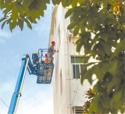 在江苏省宿迁市泗阳县桃源新村小区,工人对小区外墙进行维修补强工作。 |